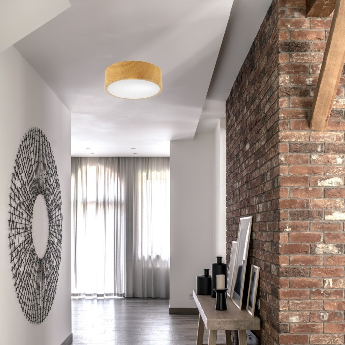 Plafon DANTE 1xE27 o średnicy 26 cm i imitacji dębu to doskonałe rozwiązanie do salonu, sypialni, korytarza lub biura.